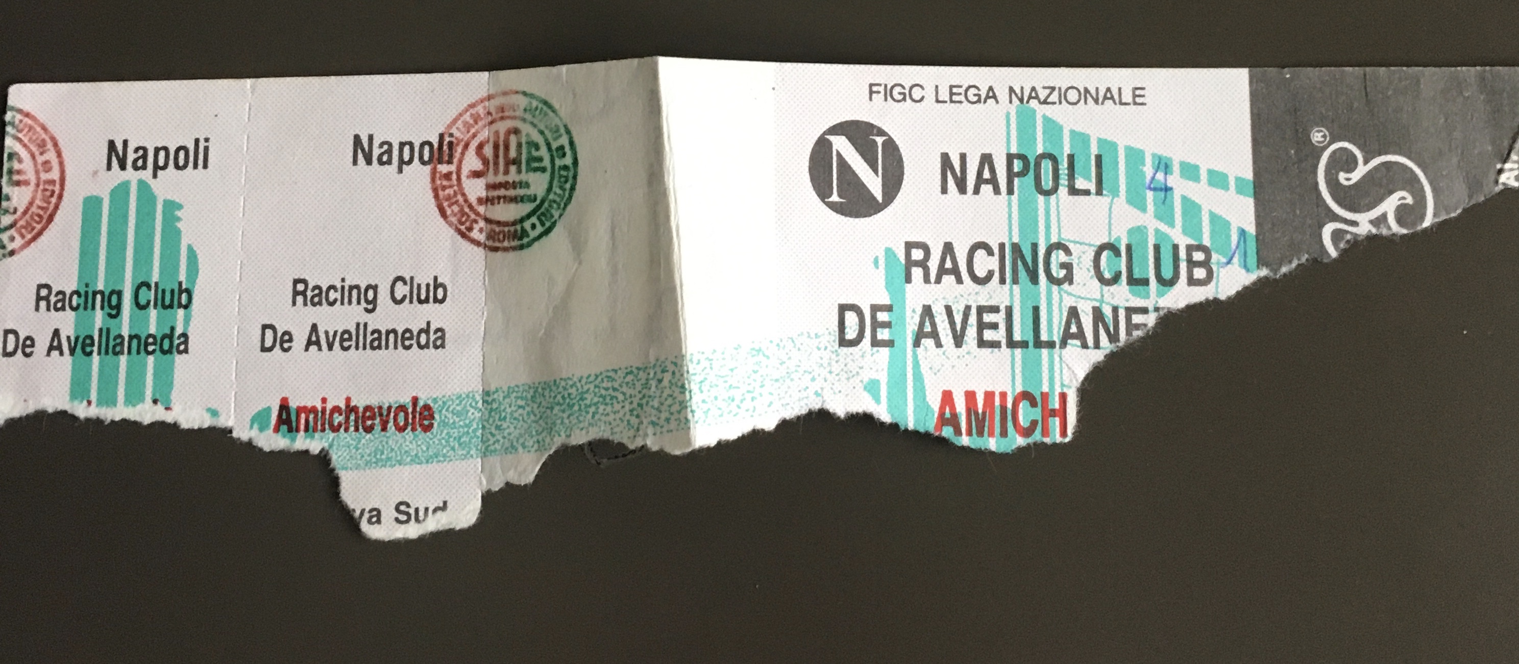 La prima volta che vidi giocare dal vivo Diego Armando Maradona, fu nell’estate del 1989 gara amichevole: presso lo Stadio Partenio di Avellino si disputò Napoli- Racing Avellaneda squadra argentina (di questa gara conservo ancora il tagliando che all’ingresso mi fu strappato orizzontalmente e che vi mostro), che schierava tra i pali Ubaldo Fillol, portiere campione del mondo con l’Argentina ai campionati del mondo del 1978. Quella sera lo stadio Partenio era esaurito, erano presenti circa 40.000 spettatori quasi tutti provenienti dal capoluogo campano. Il Napoli si stava preparando per affrontare il campionato, che poi avrebbe vinto portando in dote il secondo scudetto, erano in campo tutti i titolari, ricordo in porta il compianto Giuliano Giuliani , e c’era ovviamente Maradona che giocò una grande partita, segnando una rete, ricordo i ritmi altissimi pur essendo un amichevole, il Napoli entusiasmò tutti noi presenti, in modo particolare i suoi tifosi ed alla fine vinse con il punteggio di 4-1.