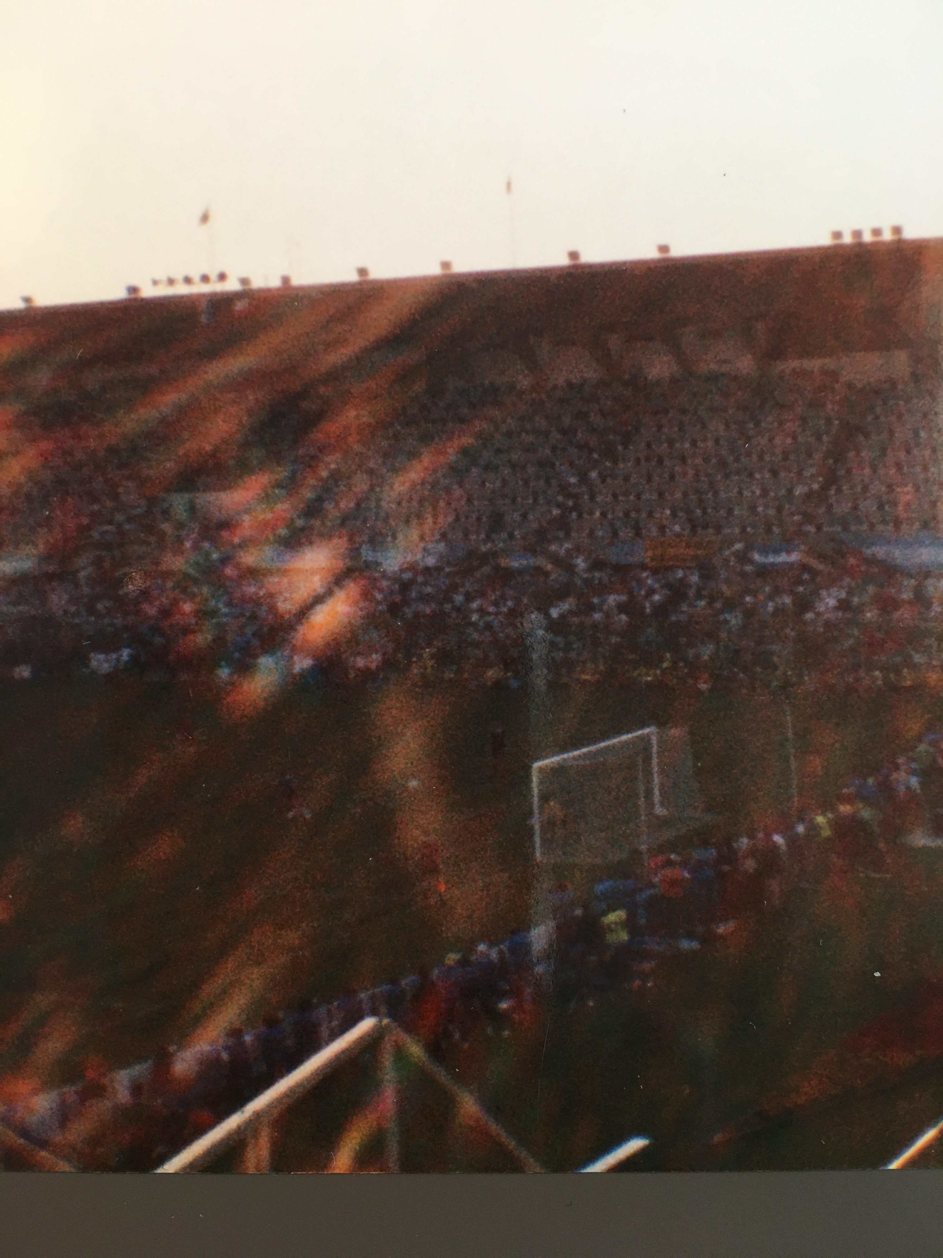 Tornando a quel 30 giugno 1990, quel giorno Firenze era avvolta dalla morsa di un caldo asfissiante, c’erano infatti ben 40 gradi e c’era una forte umidità tale da rendere molto faticoso anche il solo respirare. Quel giorno allo stadio Comunale (a quel tempo non era ancora stato intitolato alla memoria di Artemio Franchi) scattai alcune foto dalla mia postazione sugli spalti con la mia macchinetta fotografica con il rullino, per preservare il ricordo di quella partita e che vi mostro prima di continuare il racconto dei miei ricordi, in sequenza vedrete: l’ingresso delle formazioni sul terreno di giuoco, una porzione di stadio (curva Fiesole e tribuna laterale), una fase di gioco ed ,infine, il rigore calciato da Diego Armando Maradona (la qualità di quest’ultima foto purtroppo è condizionata dal riflesso del sole che stava tramontando).
